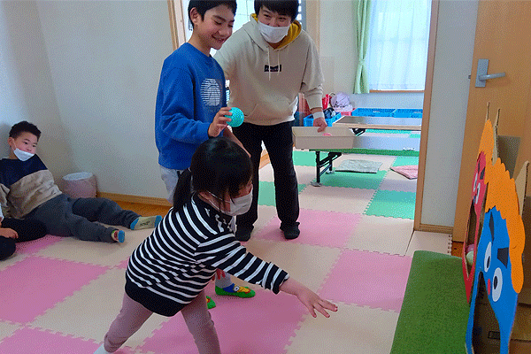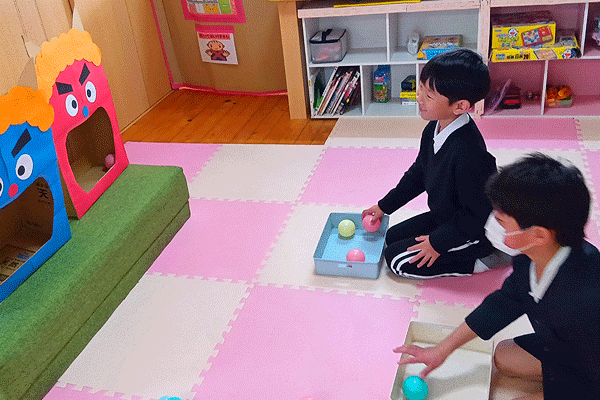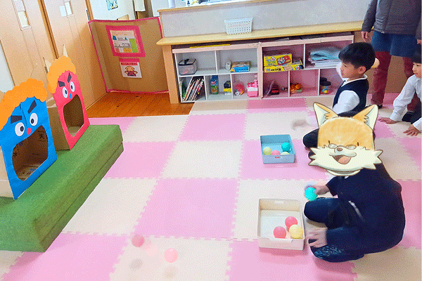 子どもたちは「鬼はそと~!!福はうち~!!」と元気な掛け声を出しながら、豆に見立てたカラーボールを鬼めがけて一生懸命投げて楽しんでいました🤾✨